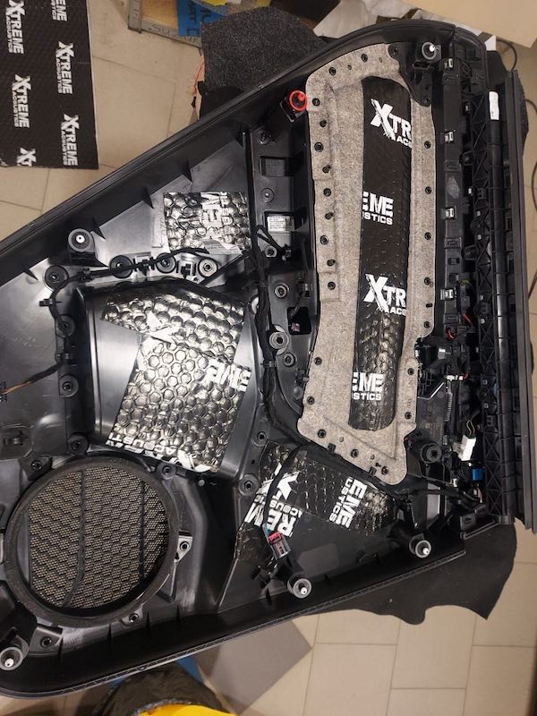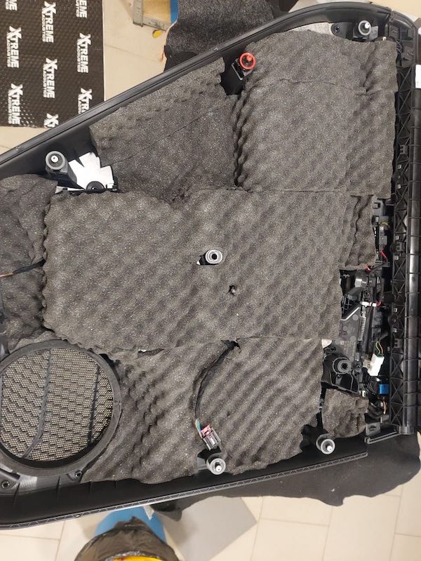 Помимо установки аудиосистемы мы в обязательном порядке сделали шумоизоляцию всех четырех дверей VW Touareg. Это не ради акустического комфорта, а ради более качественного звучания динамиков, особенно мидбасов.